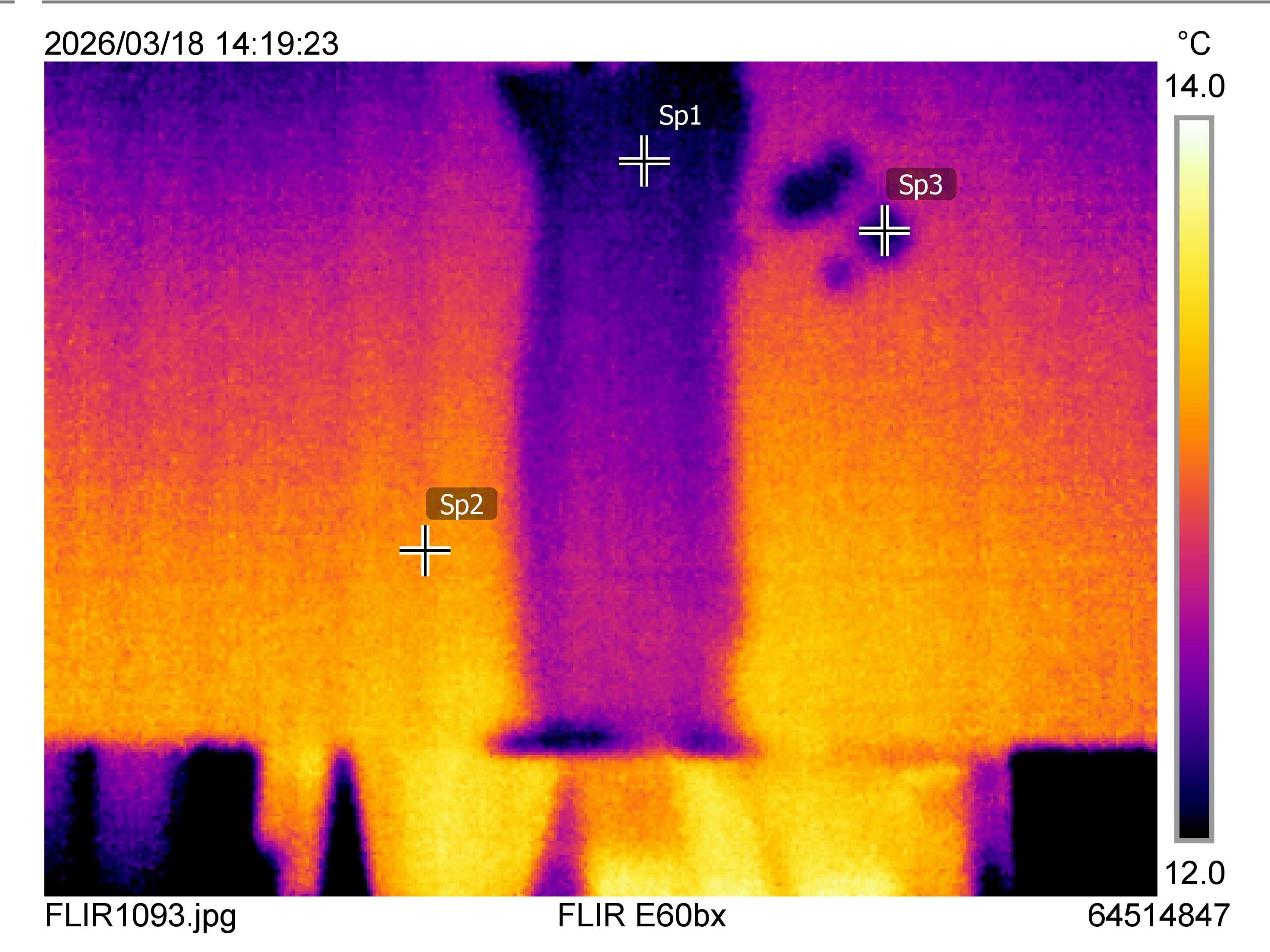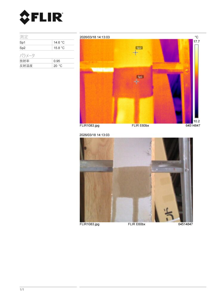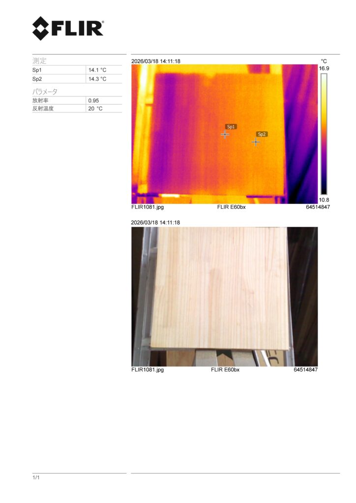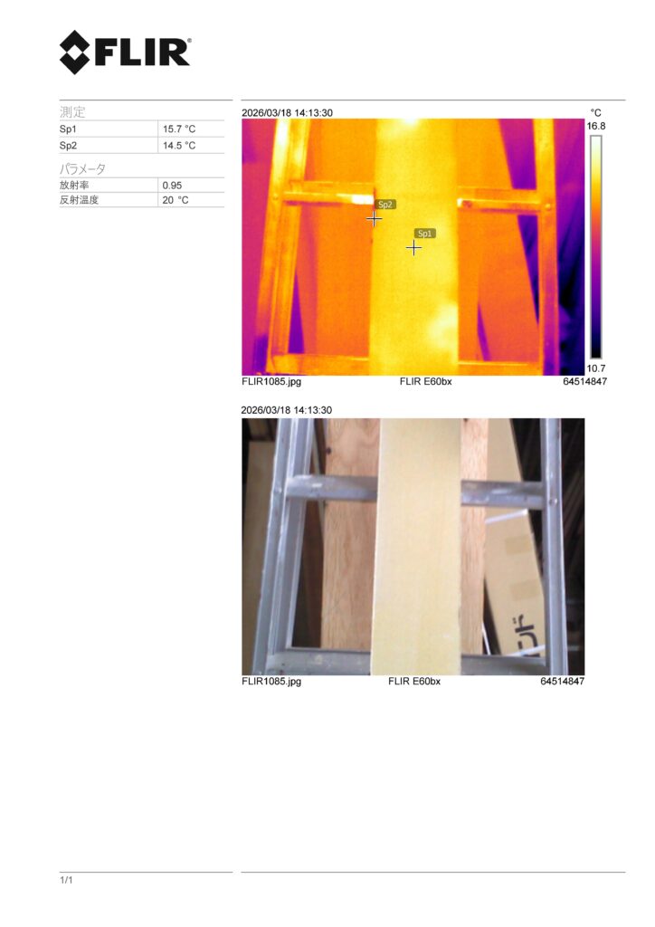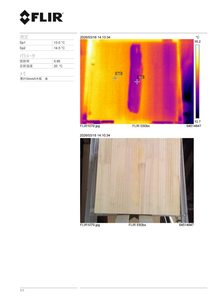 水を塗った面の裏面です。ぱっと見には水のあとは見えませんが、赤外線サーモグラフィーカメラで撮影すると、あきらかに温度差があることがわかります。